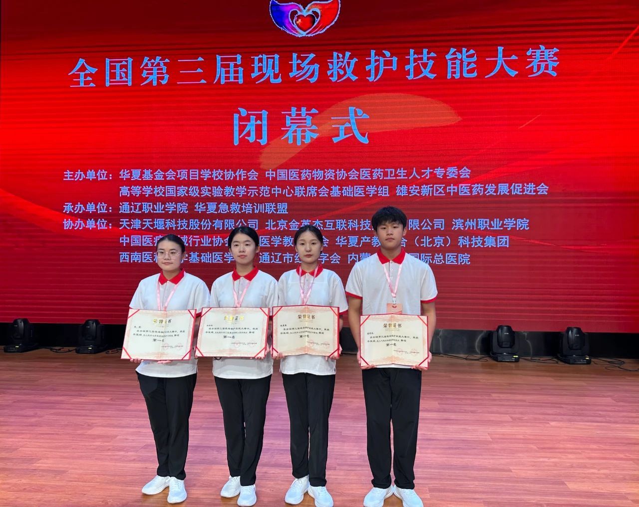 近日,太阳成集团tyc234cc在中国医药物资协会医药卫生人才专委会、高等学校国家级实验教学示范中心联席会基础医学组等单位联合主办的“全国第三届现场救护技能大赛”中喜获佳绩。太阳成集团tyc234cc赵聪聪和赵婕同学荣获非医学组双人徒手心肺复苏现场救护与管理赛项第一名,张梓楠同学荣获非医学组成人气道异物梗阻现场救护赛项第一名,田梁烁同学荣获非医学组突发意外单个危重创伤病人现场救护赛项第一名,孙丽娜老师和杨丽娟老师分别荣获团体第一名优秀指导教师,学校荣获非医学组团体第一名。
