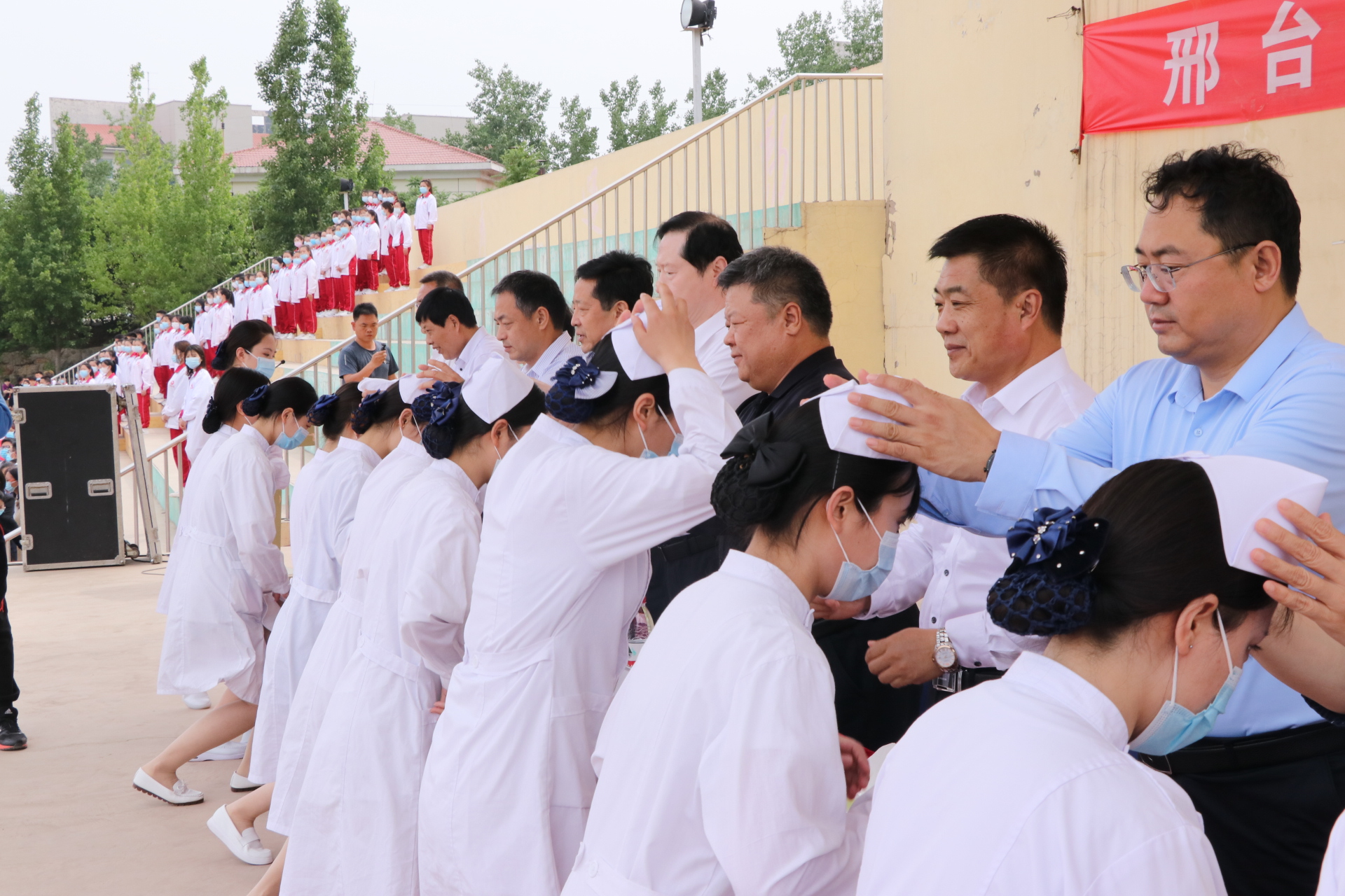 授帽仪式是护士学生成为一名真正护士的重要时刻,对于护理专业的学生意义重大。“5•12”护士节授帽仪式活动是太阳成集团tyc234cc每年举办的品牌活动之一,每年的护士节授帽仪式活动,学校领导及太阳成集团tyc234cc、相关部门负责人同皇寺校区全体师生一同参加,学校及太阳成集团tyc234cc领导为即将实习的护理专业学生代表戴上圣洁的燕尾帽。太阳成集团tyc234cc老师带领全场护理专业学生在南丁格尔画像前庄严宣誓,铮铮誓言表达了同学们不辱白衣天使神圣使命的决心。