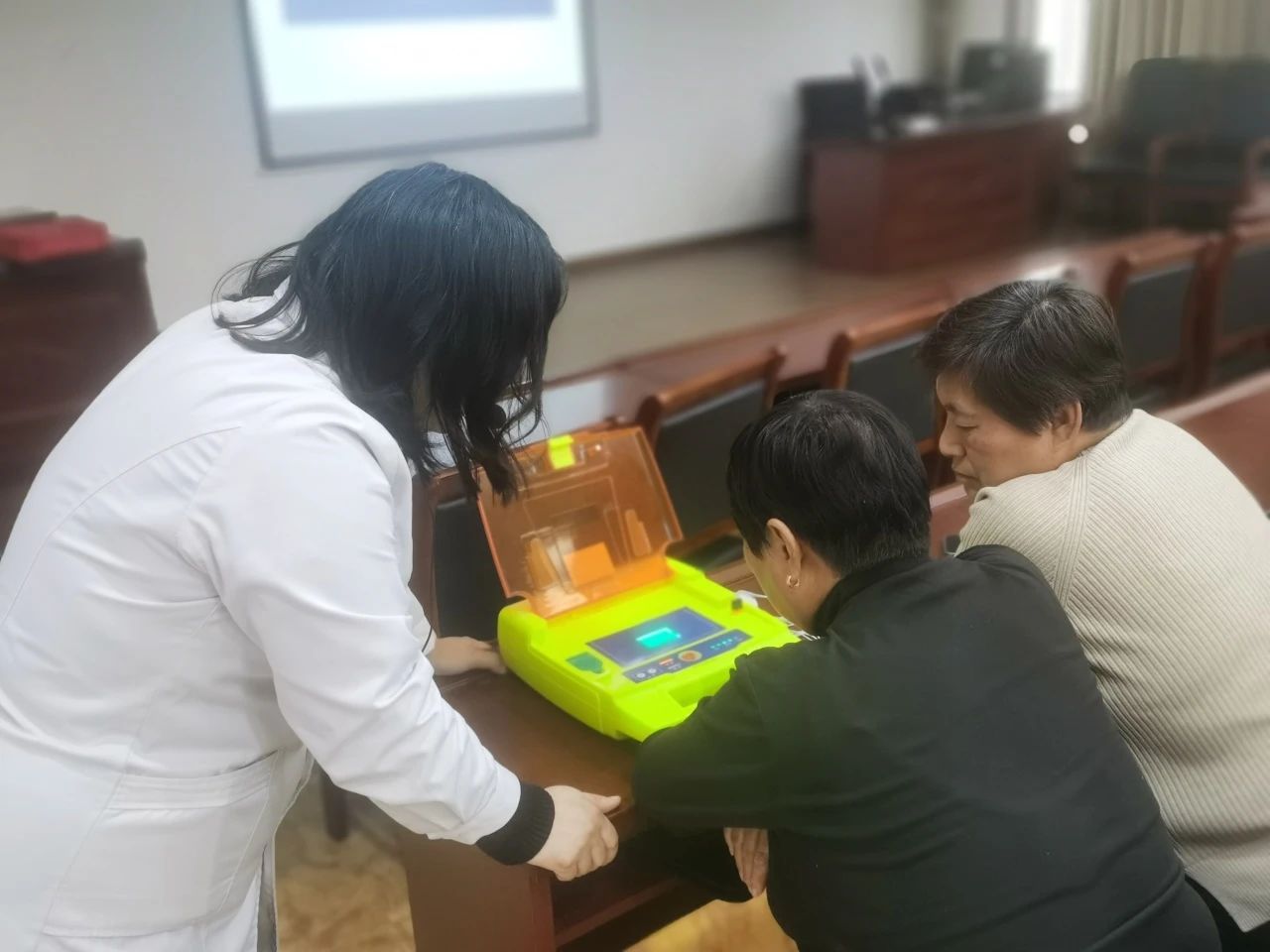 活动中,教师志愿者杨丽娟和李军省为居民和社区工作人员进行了心肺复苏的标准操作演示,详细介绍了心脏骤停的预防与诊断等相关知识,深入浅出地讲解了使用AED的重要性、操作步骤以及注意事项。最后,教师志愿者组织居民和社区工作人员进行模拟急救训练,通过实际操作使群众更好地掌握了心肺复苏的流程和AED的正确使用方法。